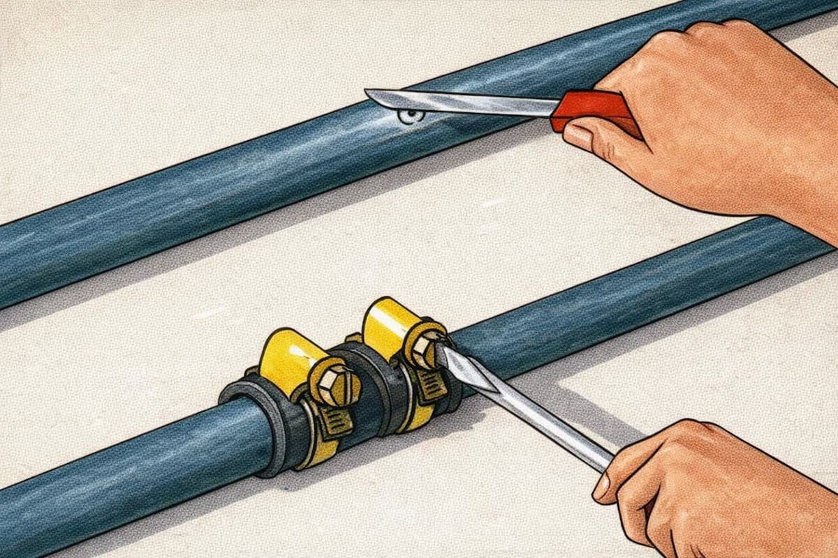 Tape el escape con un poco de masilla –sintética o epoxídica, según la tubería-. Si no tiene masilla, rodee la zona afectada con un trozo de caucho o goma y fíjelo con alambres o con unos collares de ajuste.