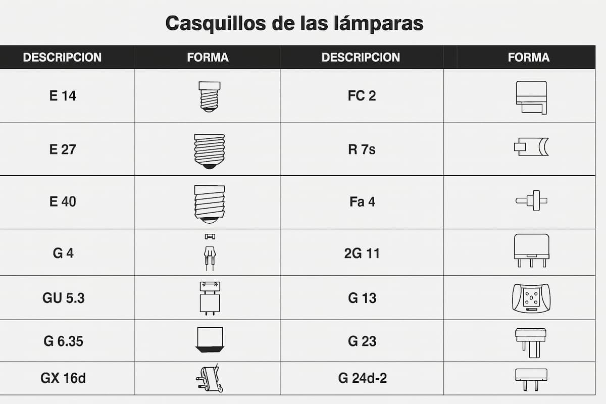 Esta figura servirá para orientarte en conexiones o casquillos de diferentes tipos de lámparas de luz aun para las fluorecentes.