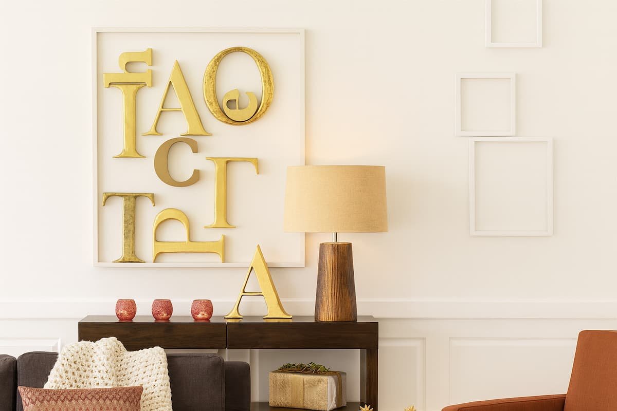 Colgar en la pared unas cuantas letras pintadas de oro y enmarcarlas por un marco blanco dejando una fuera del marco es una idea excelente y rompedora.