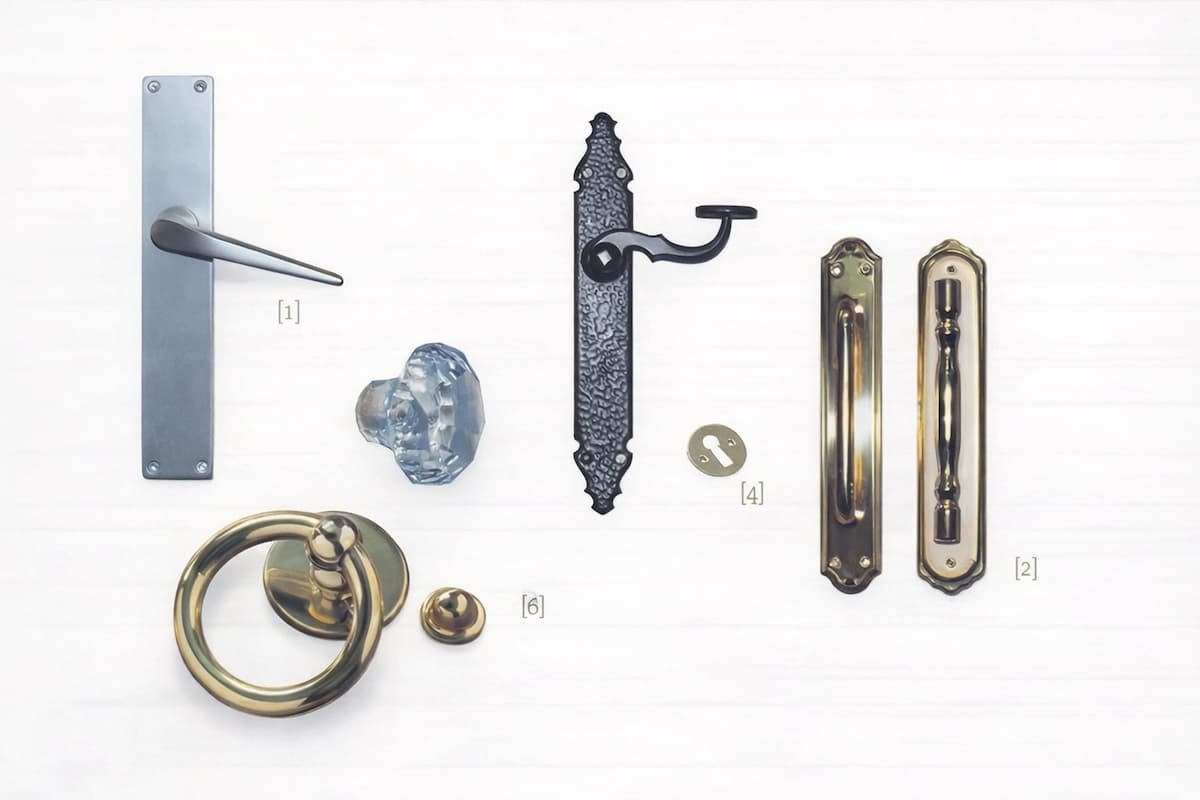 Además de los que pueden ser de roseta o de placa larga (1), también hay un gran surtido de picaportes-tiradores en forma de U, en escuadra, verticales (2), horizontales,…-, pomos (3) y bocallaves (4).