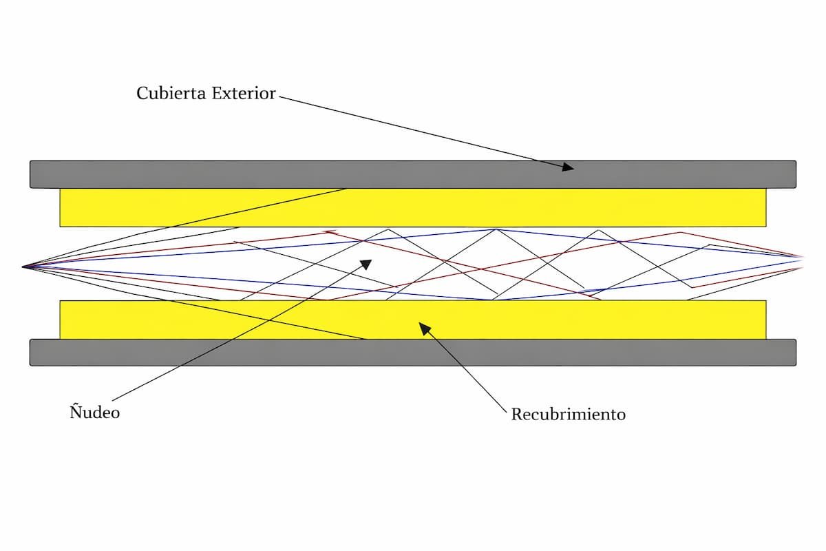 En este tipo de fibra viajan varios rayos ópticos reflejándose a diferentes ángulos como se muestra en la figura.