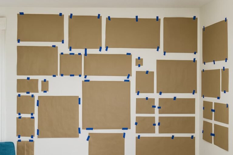 Cómo colgar un conjunto de cuadros tips y guia especiales.  Que se necesita  Papel de diario, cinta adhesiva, martillo, clavos, taladros eléctricos y tacos. Dificultad   Haga plantillas de papel del mismo tamaño que los cuadros; unas simples plantillas, pegadas con cinta adhesiva a la pared, le serán muy útiles parar planificar la distribución. Vaya