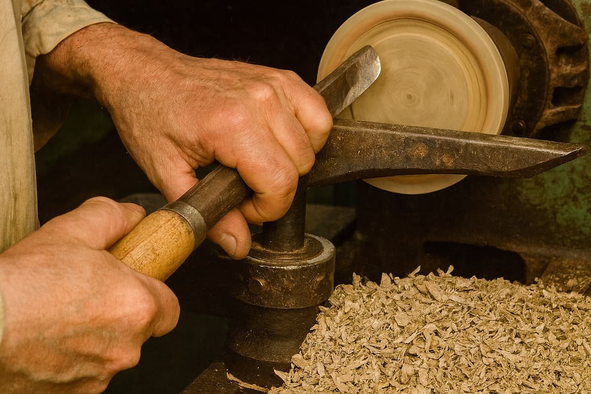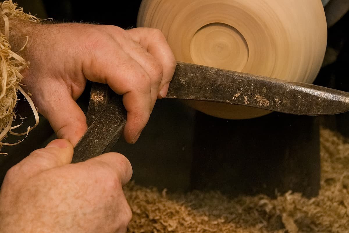 Con el escoplo, un formón plano con punta sesgada se corta un plato que llega a ser la tapa.