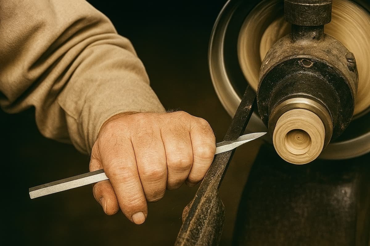 La mano izquierda se coloca sobre él apoya herramientas y dirige el instrumento, la derecha determina el ángulo del corte y la presión con que el acero labra la madera. Al mismo tiempo debe prestarse atención a la posición que mantiene el cuerpo con relación al torno.